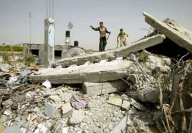 Palestinian boys inspect the debris of their family house after it was demolished by Israeli bulldozers at Beit Hanoun town in the northern Gaza Strip, May 10, 2003. The Israeli army said the house belonged to a Hamas activist. Israel, awaiting U.S. Secretary of State Colin Powell on a new peace mission, will balk at easing its military grip on Palestinians until they rein in armed militants, political sources said on Saturday. REUTERS/Suhaib Salem