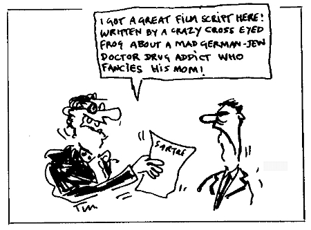 So why, you may ask, was the movie never actually made? Why do we have to read it in an impossibly expensive hardback instead of seeing it on our Christmas TV screens alongside Moonraker and Son of Lassie? Sartre in fact abandoned the script after hostility and demands for changes from the American director, John Huston, who originally commissioned it. Admittedly Sartre’s script was on the long side – something like seven hours. (Sartre did have problems writing to length – a couple of years as a hack on Socialist Worker Review would have done him a world of good). But other long films have been made – for instance Bertolucci’s trashy and pretentious 1900.