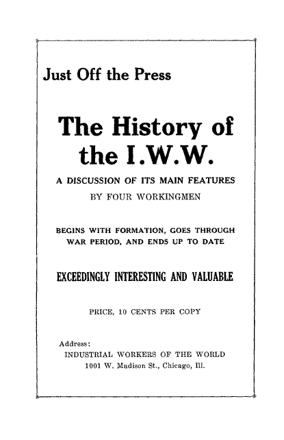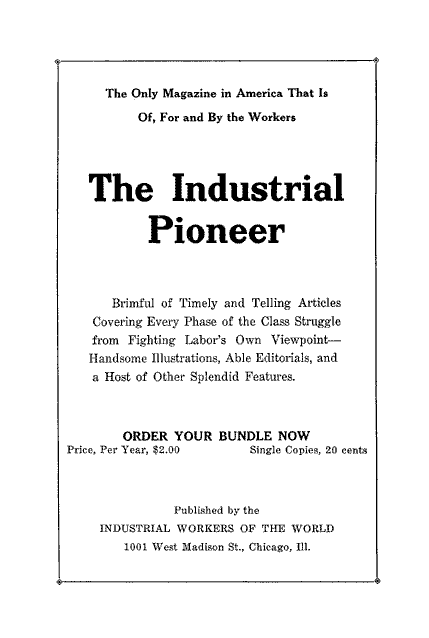 The term "Industrial Communism" used in this pamphlet requires some explanotion. When the pamphlet was published, in or around 1924, the term "communism" did not have the specific meaning it has acquired since then. The bloody career of the totalitarian dictatorships calling themselves "Communist republics" was then unknown (although the Wobblies had already foreseen it), and the Communist Party of the United States had existed for only three or four years.