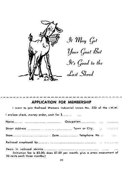 The translation of this program from paper into living reality is YOUR job. The members of the I. W. W. are men just like you, railroad workers who are anxious to do something about our miserable wages and working conditions, and are willing to devote some time and energy to seeing that something is actually done about them. But they can no more give you the wages and working conditions and industrial form of organization outlined here than they can give you the moon. It’s up to you to join and help get them.