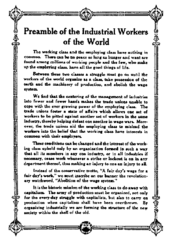 Craft unionism is based on the tool that we use. This wornout, corrupt system no longer offers any promise of improvement in this industrialized age, but only presents a perpetual struggle for slight relief under the system of wage slavery. It shatters the ranks of workers into fragments, rendering us helpless in our industrial struggles. Separation of craft from craft renders industrial and financial help impossible. Craft jealousy leads to the creation of trade monopolies. Contracts force union men to scab against union men, while craft divisions hinder growth of class consciousness, and foster the idea of harmony of interest between the contractors and workers.