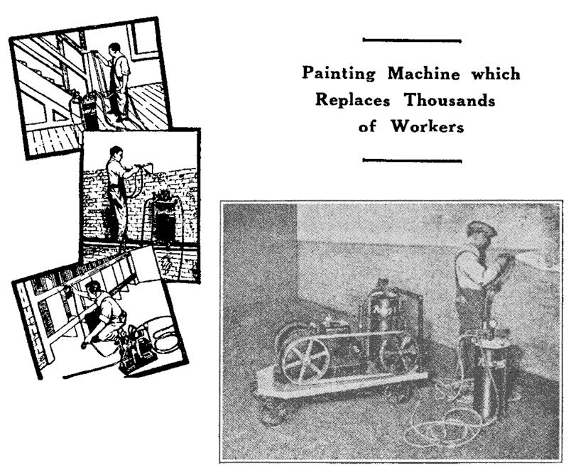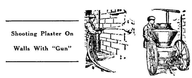 Concrete has been used for many years and it has eliminated thousands of workers from the building industry, but the most far-reaching elimination of labor from the building construction field is now taking place in remote places, with a machine that smoothes the walls and plastering is applied without any lath. With the plastering guns in use it will do a way with carpenters, lathers, plasterers, and bricklayers, not to mention the effect that it will have on the steel mills, mines, and lumber mills, when millions of yards of metal lath and millions of feet of lumber will not be needed because of the new method.