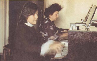 Alexander Lozovan, a civil engineer, listens to his daughter Natasha play on the piano. (circa 1950s) |