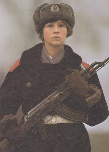 A young woman stands vigilant guard over a WWII Monument. (circa 1980s) |