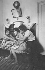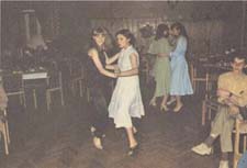 Two girls dance with each other, while a boy akwardly looks on. (circa 1980s) |