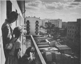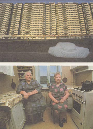 ![]() | Two retired workers live together in this apartment complex, in the lower half sitting in their kitchen. Around 20% of city dwellers lived with roomates. |