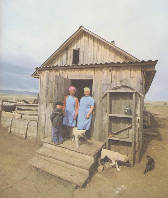![]() | A family living on a collective farm, primarily grazing land for cattle and sheep, pose in front of their house, near to the border of Mongolia. |