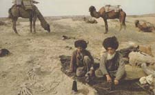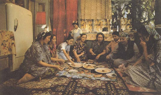 A Muslim family sit on elaborate Bukhara rugs for a healthy lunch, eating palov — rice, mutton, and vegtables. (circa 1980s) |