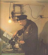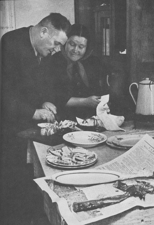 Ivan Teslenko, the elected chairman of a collective farm, prepares an evening meal with his wife. (circa 1950s) |