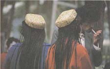 Young women wearing gold-embroidered caps called doppi, have their hair coiffed into 40 some plaits. (circa 1980s) |