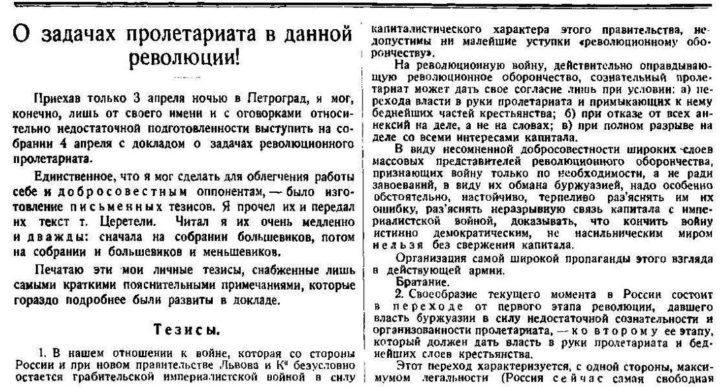 Tales eran los puntos de vista de los dirigentes bolcheviques en Petrogrado, cuando el 3 de abril Lenin llegó a la estación Finlandia y al día siguiente presentó ante los delegados bolcheviques a la Conferencia Panrusa de Soviets de Diputados de Obreros y Soldados su famosa "Tesis", las cuales, en contraste con la posición de Kamenev-Stalin sobre la guerra, reafirmaban el llamado anterior de Lenin rechazar totalmente el "defensismo revolucionario" y abogaban por la fraternización en el frente, adoptando las perspectivas de Trotsky y caracterizando al "momento actual" como una transición entre la primera etapa "liberal-burguesa" de la revolución y la segunda etapa "socialista", durante la cual el poder sería transferido a manos del proletariado. En cuanto al Gobierno Provisional, las tesis de Lenin rechazaban la fórmula de "apoyo limitado" de Stalin-Kamenev y pedían en cambio el rechazo total del Gobierno Provisional, descontando como absurda la posibilidad de reunificación con los mencheviques. El principal eslogan bolchevique desde entonces sería la transferencia de todo el poder a los soviets, lo que daría como resultado el armamento del pueblo, la abolición de la policía, el ejército y la burocracia estatal, la confiscación de todas las propiedades de los terratenientes y la transferencia del control sobre la producción y distribución de bienes a manos de los trabajadores. En la Séptima Conferencia de Rusia del POSDR(b), que se reunió en Petrogrado del 24 al 29 de abril, las posiciones de Lenin sobre el Gobierno Provisional y sobre la guerra obtuvieron el apoyo de la mayoría.