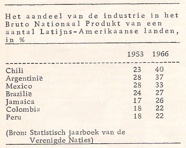 Het directe gevolg van deze veranderde oriëntering van de imperialistische investeringen is een vergroting geweest van het aandeel van de industrie in het bruto nationaal product in een hele reeks Latijns-Amerikaanse landen. Deze beweging treedt duidelijk niet overal op. Zij heeft de Midden-Amerikaanse landen, Paraguay en Ecuador praktisch onberoerd gelaten. Men heeft haar sterk afgeremd in Argentinië. Niettemin is de verandering in een aantal gevallen over een periode van 14 jaar, van 1953 tot 1966 zeer duidelijk: