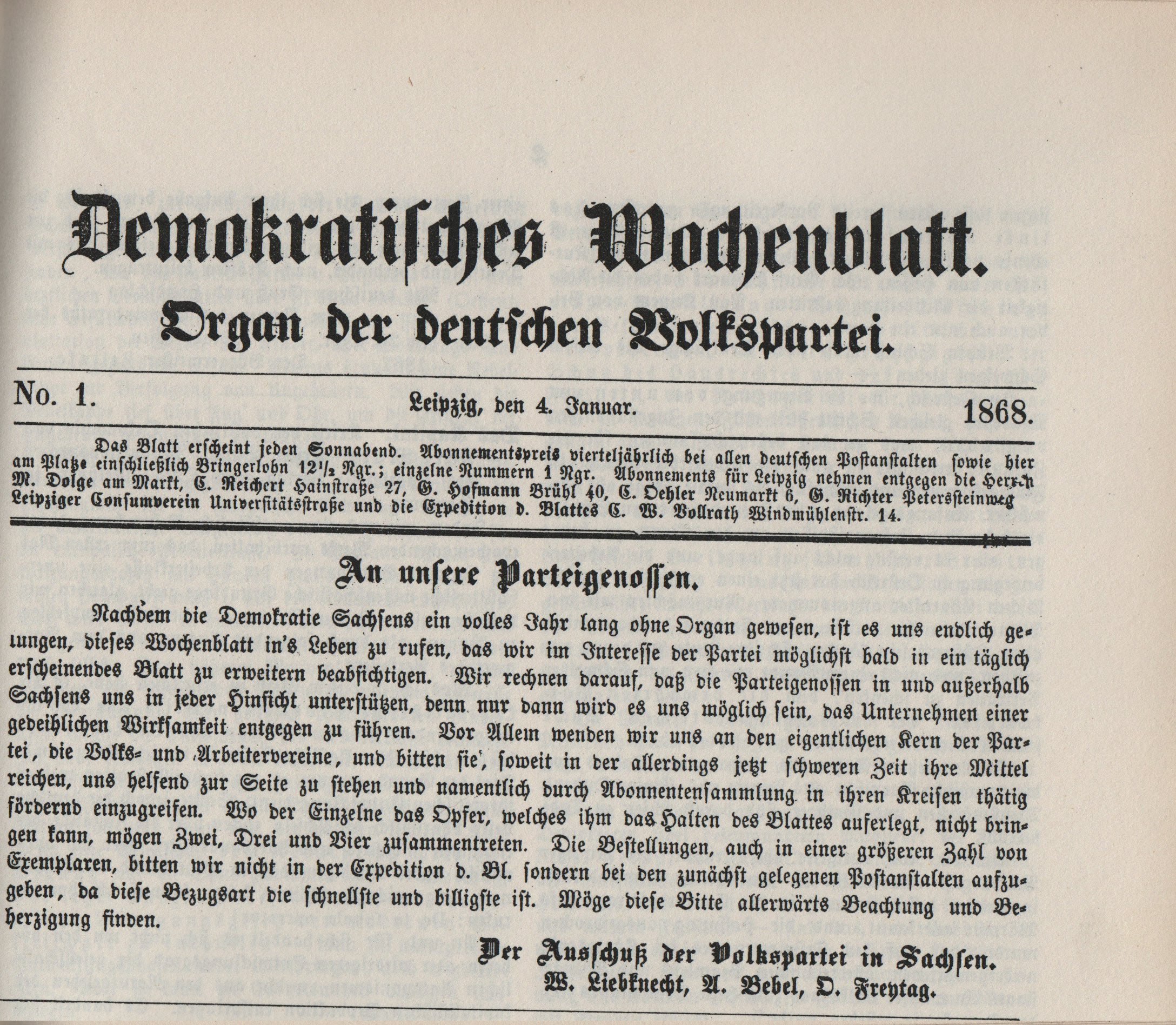 (Janeiro de 1868 a Setembro de 1869): Jornal operário alemão, editado em Leipzig sob a direcção de W. Liebknecht. O jornal desempenhou um importante papel na criação do Partido Operário Social-Democrata alemão. No congresso de Eisenach, em 1869, foi declarado órgão central do Partido Operário Social-Democrata e mudou de nome para Volksstaat. Marx e Engels colaboraram no jornal.