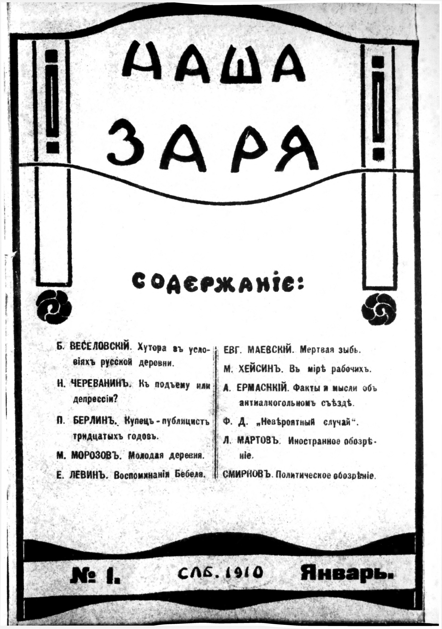 (1910-1914): Revista mensal legal dos mencheviques liquidacionistas. Publicou-se em Petersburgo de Janeiro de 1910 a Setembro de 1914. Em volta da Nacha Zariá formou-se o centro dos liquidacionistas na Rússia. Defendia a criação de um novo partido operário legal reconhecido pelo tsarlsmo.