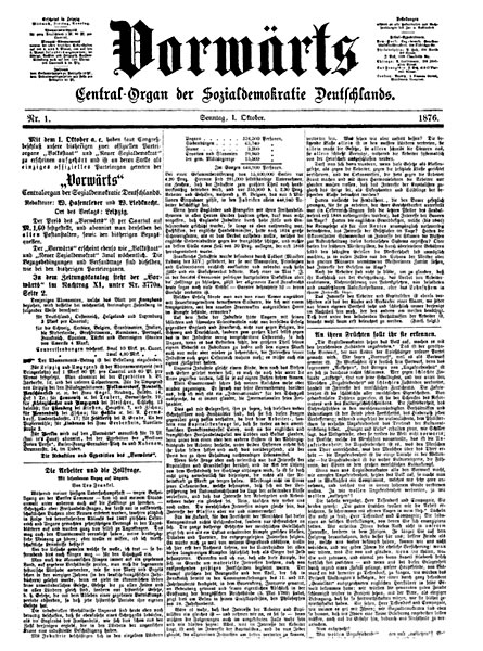 (1876): Jornal diário fundado em 1 de outubro de 1876, órgão oficial do Partido Social Democrata (SPD) da Alemanha, deixou de ser publicado em 14 de abril de 1989 tendo circulado por 113 anos. Em 1922 chegou a ter duas edições diárias, com 300 mil exemplares. Em 1933 foi fechado por ordem de Hitler tendo voltado a circular só após a Segunda Guerra Mundial. Nas páginas do jornal Engels conduziu a luta contra todas as manifestações do oportunismo. W. Liebknecht foi director do jornal até 1900. A obra de Engels Anti-Dühring foi publicada no jornal entre 3 de janeiro de 1877 e 7 de julho de 1878. A partir da segunda metade da década de 90, depois da morte de F. Engels, a redacção do Vorwärts passou para as mãos da ala direita do Partido, publicando sistematicamente artigos artigos dos oportunistas, que dominavam na social-democracia alemã e na II Internacional. Durante a guerra imperialista mundial (1914-1918), o Vorwärts manteve-se numa posição socíal-chauvinista; depois da Grande Revolução Socialista de Outubro o jornal dedicou-se à propaganda anti-soviética. Entre 1933 e 1938 (período nazista) foi editado no exílio na Tchecoslováquia e e posteriormente em Paris até 1940. Em 1948, o jornal foi refundado como Neuer Vorwärts e em 1955 renomeado Vorwärts novamente.