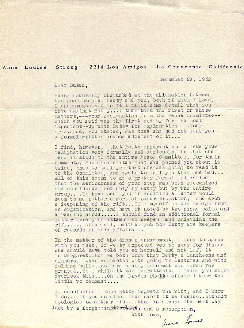 Being naturally disturbed at the alienation between two good people, Betty and you, both of whom I love, I encourage you to tell me in some detail what you have against Betty....I then took the first of these matters, — your resignation from the Peace Committee — which you said was the first and by far the most important — up with Betty for explanation... Your grievance you stated, was that she had not sent you a formal written acknowledgment of it...