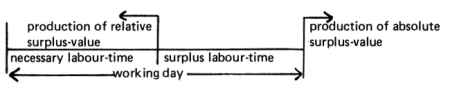 Production of "absolute surplus-value" (SG 50) is possible by mere prolongation of the working-day, even though the productivity of labour (SG 51) remains constant. Socially, the production of "relative surplus-value" (SG 52) is possible only by an increase in the productivity of labour which leads to a reduction in the value of the industrial commodities that serve as the labourers' means of life. The analysis at this point proceeds under the assumption of presentation that the class struggle is limited to the maintenance of uniform, real wages (SG 53) (which is expressed by Marx as: commodities, including labour power, are exchanged at their values). This assumption will be relaxed in Paper 5.