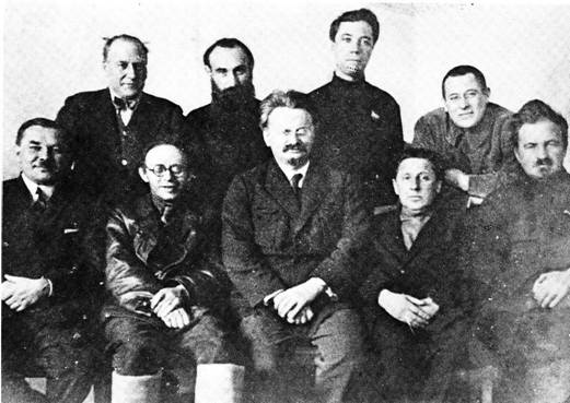 De främsta ledarna i Vänsteroppositionen 1927. Från vänster till höger, sittande (främre raden): L. Serebrjakov, K. Radek, Trotskij, M. Boguslavskij och J. Preobrazjenskij. Stående: C. Rakovskij, J. Drobnis, A. Beloborodov och L. Sosnovskij