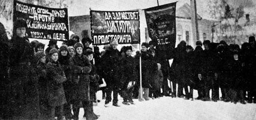 Vänsteroppositionella demonstrerar i en exilkoloni (i Jeniseisk, Sibirien) i november 1928. På banderollerna står det: Vänd elden mot högern, mot kulaken, nepmannen och byråkraten. På banderollen i mitten, den med bilder av Lenin och Trotskij, står det ”Leve proletariatets diktatur”.